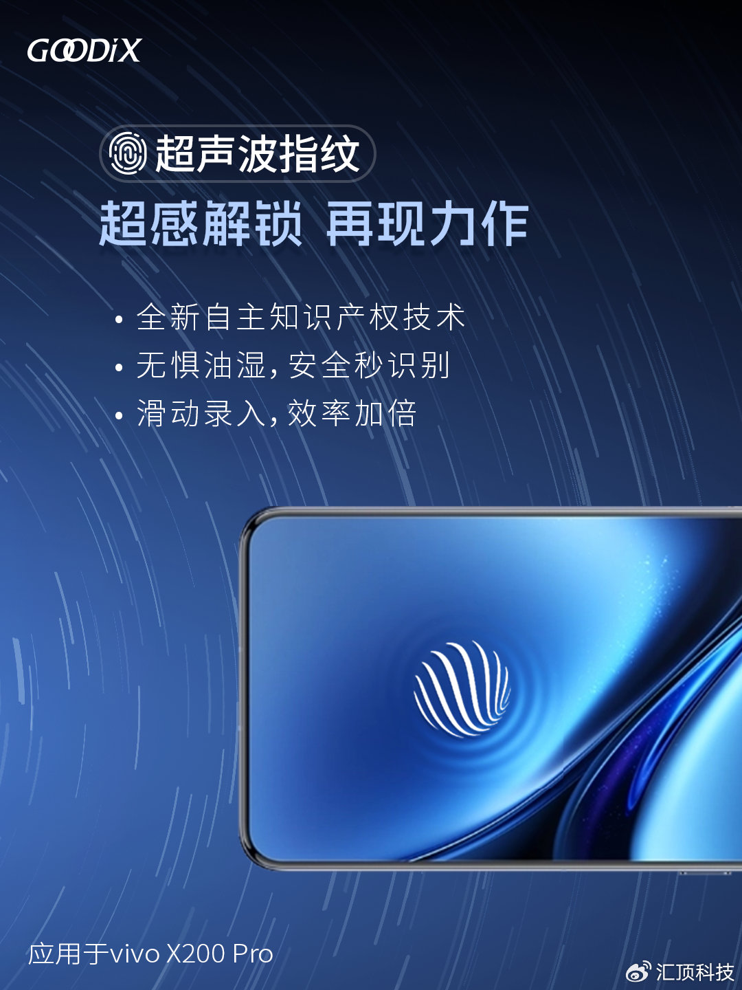 vivo X200 Pro 手机采用汇顶超声波指纹方案,引入业界首创的超声波指纹“滑动录入”功能。据介绍,基于汇顶图像算法技术,用户在指纹区域转圈移动手指,即可录入指纹。