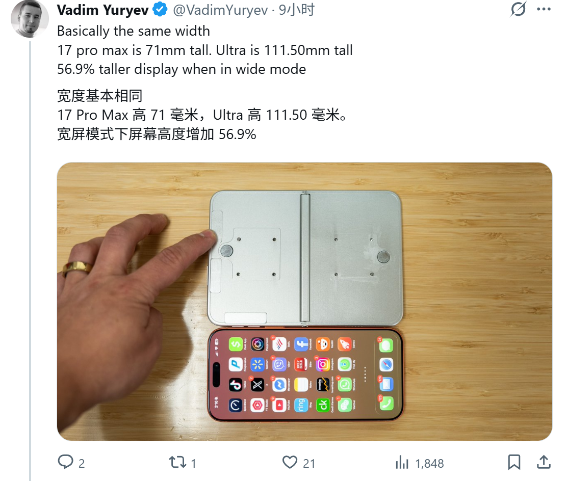 IT之家 4 月 23 日消息,消息源 @VadimYuryev 昨日(4 月 22 日)在 X 平台发布推文,分享了一组机模照片,展示了苹果首款折叠手机(上市后预估叫 iPhone Ultra)。