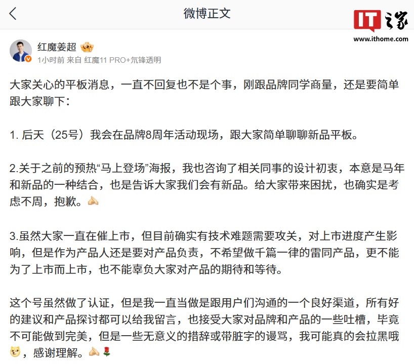 IT之家 4 月 23 日消息,红魔游戏手机产品总经理姜超今日发布说明,聊起了新平板的相关信息。同时,他也为之前的“马上登场”主题预热海报进行了致歉,称本意是想将马年和新品结合,但带来了困扰确实是考虑不周。