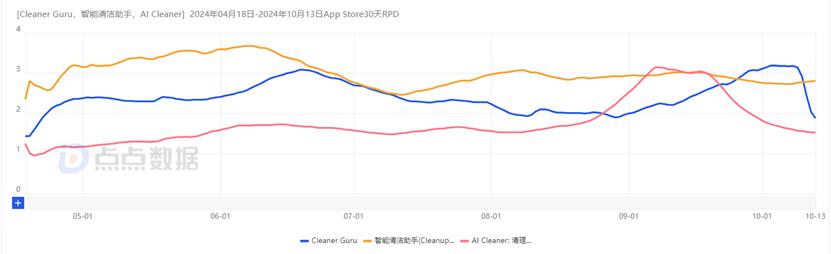 三款产品的近半年 30 天 RPD 数据,注:图中产品为 Cleaner Guru,Codeway 的 Cleanup,以及 AI Cleaner,在美国工具畅销榜上分别排第 2、第 3 和第 10。