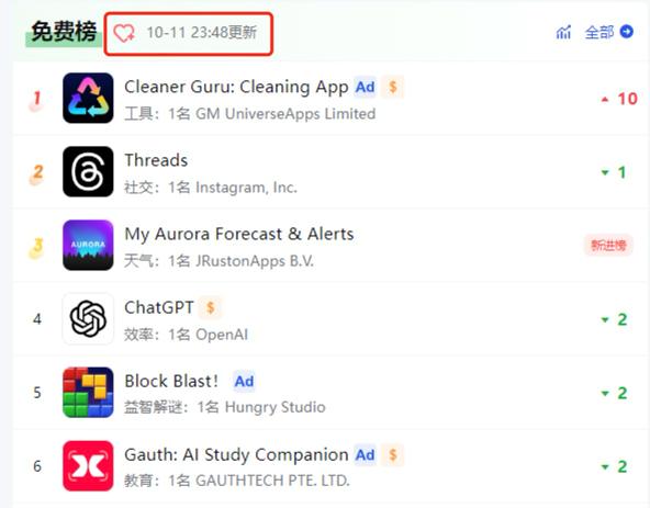 10 月 11 日夜间更新的榜单数据,Cleaner Guru 登顶美国下载榜|图片来源:点点数据