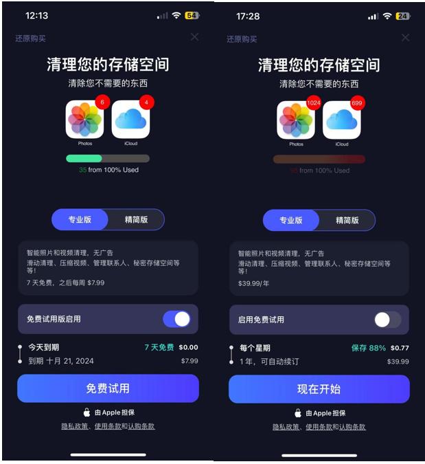 而在付费页面中,Cleaner Guru 则会给出 7 天的免费试用,用户如果不想让之前选照片的努力白费,就会倾向于点击免费试用,除此之外,退而求其次,Cleaner Guru 还提供 6.99 美金的精简版,供用户选择。而在定价层面,如果用户选择免费,那么就会自动选择 7.99 美金/月的订阅项目,但如果直接包年购买,则只需 39.99 美金,每周不到 1 美金,而且页面上还突出了“Save 88%”,让包年订阅的用户认为自己“赚到了”。
