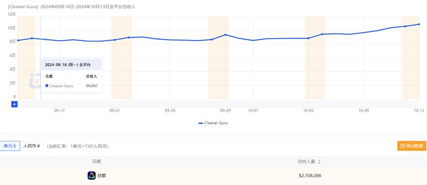 基于这一观察,编辑部的各位同事们都对 Cleaner Guru 能够登顶美榜,相当之震惊。更难能可贵的是,Cleaner Guru 近 30 天的收入还能达到 270 万美金……这让我们对这款产品更加好奇了。