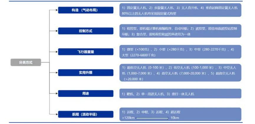 按飞行器重量分类:分为微、小、中、大型,其中微型无人机重量在100克以下,小型无人机重量不足280千克,中型无人机重量范围为280-2270千克,大型无人机重量范围为 2270-6800千克;