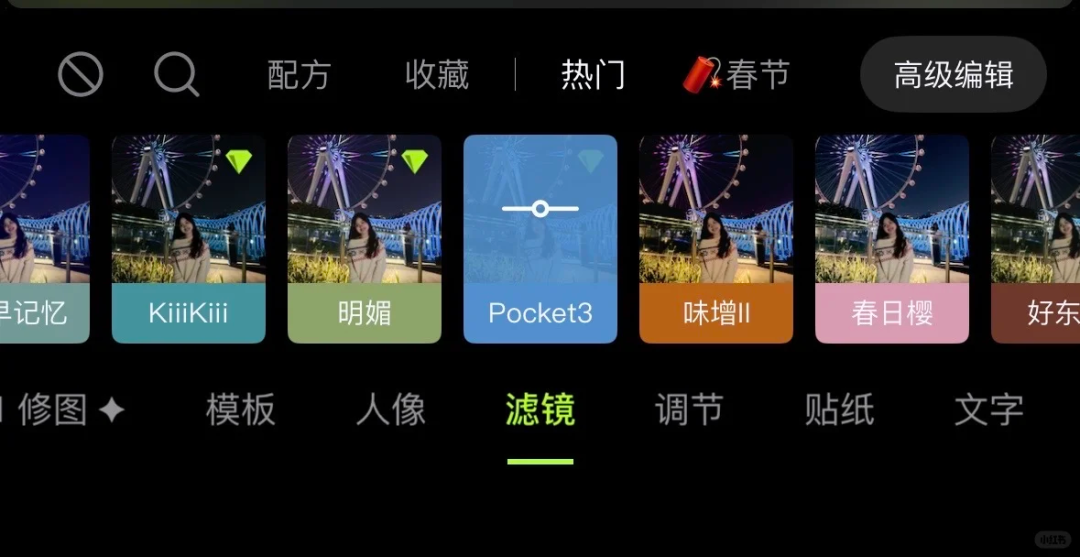 是的,你没看错,我那天真在一个修图 App 里面发现了用来模拟大疆 Pocket 3 成片效果的滤镜。。。