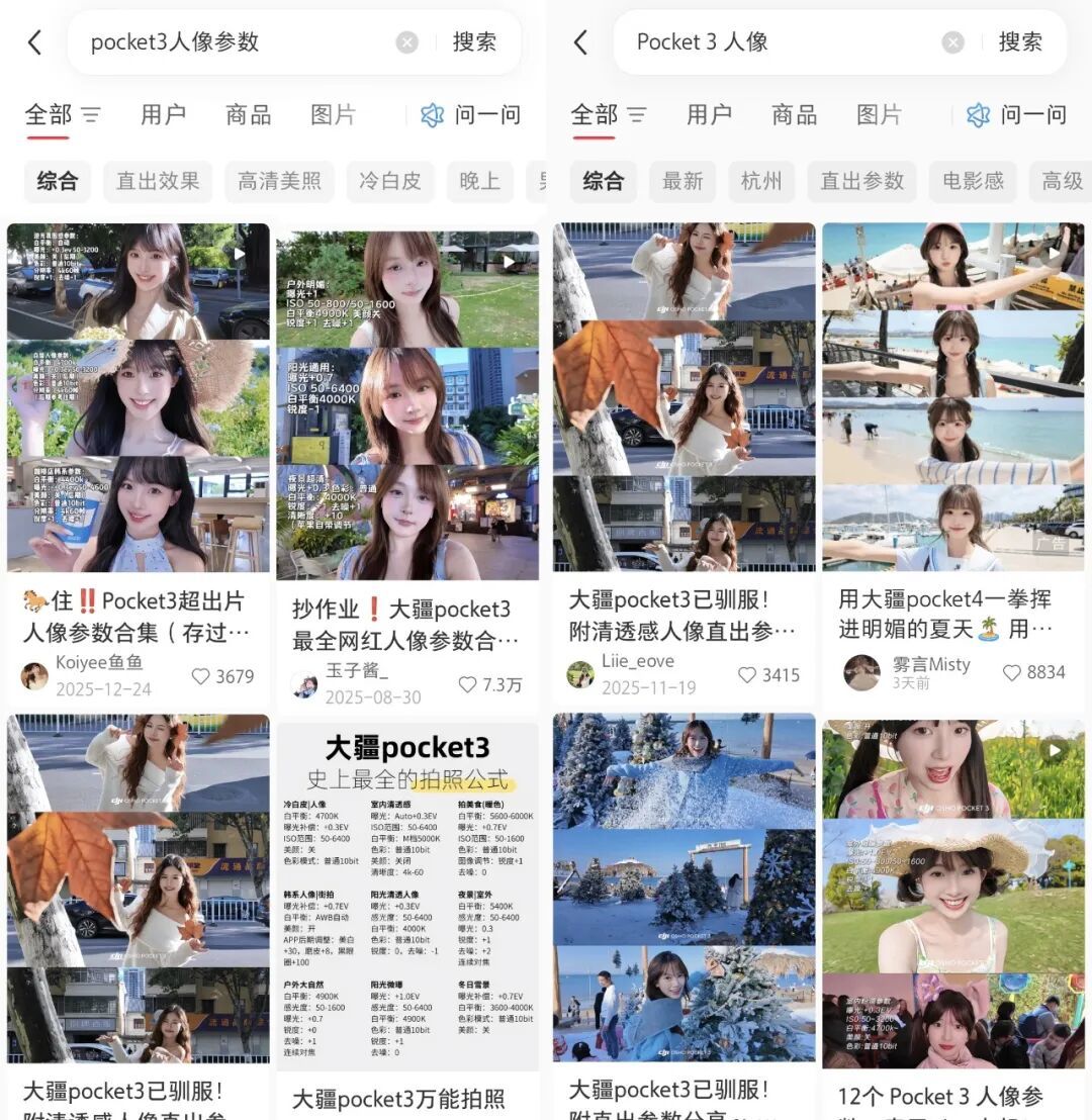 大疆 Pocket 系列也正因为这一点,在某书某音上拥有大量拥趸,随便一搜就有大量的人像出片教程,从调参到后期一条龙服务。