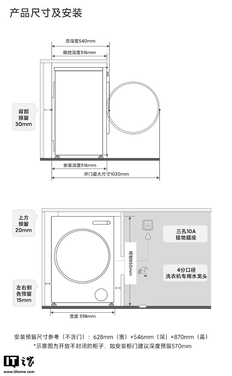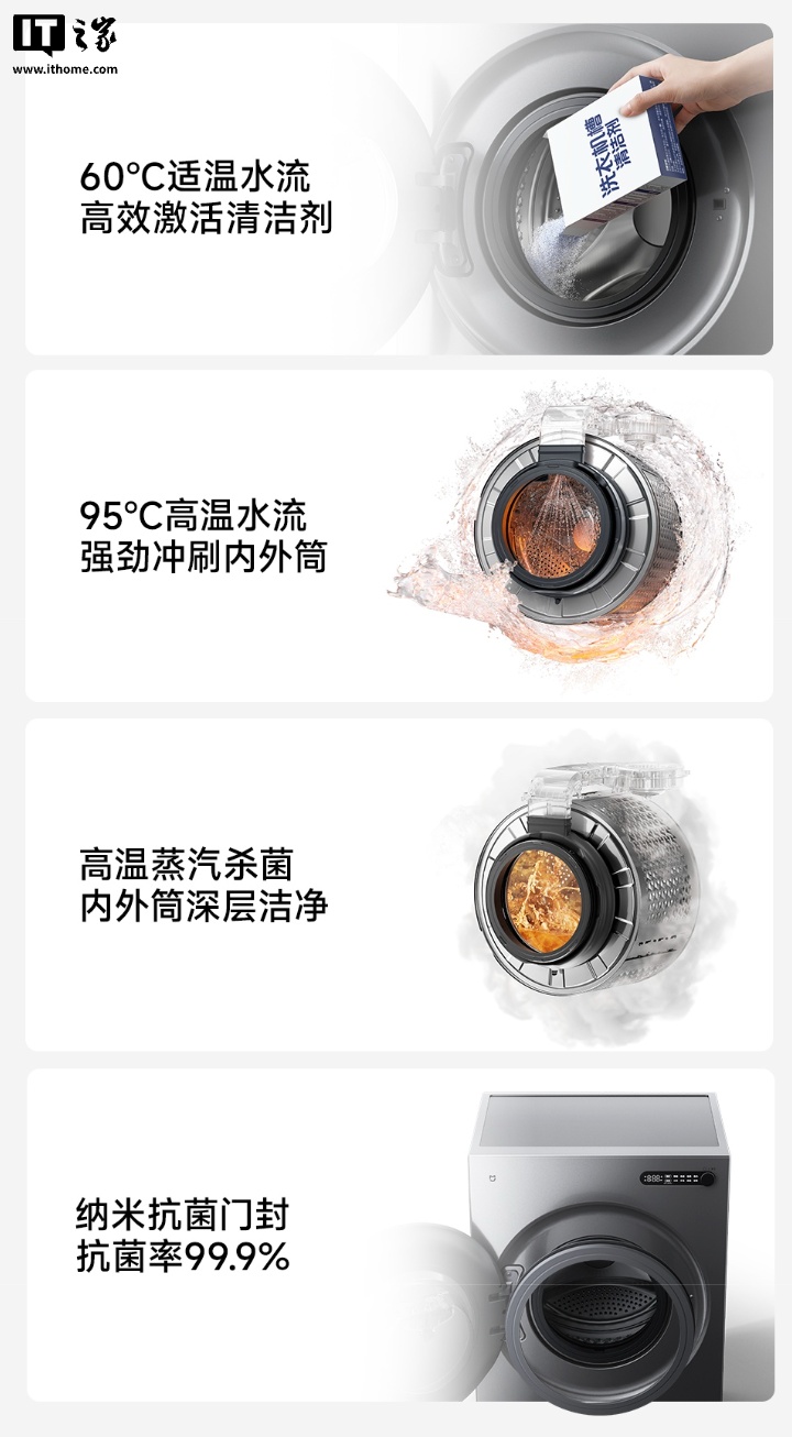 该洗衣机总深度 540mm,筒径 525mm,可容纳 10Kg 衣服。其提供 1.25 洗净比,支持 3 重筒清洁,提供 7 重降噪设计,同时支持小米澎湃智联。