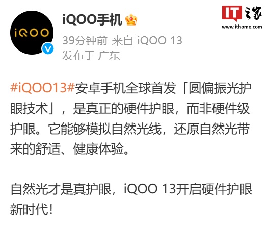 IT之家 10 月 15 日消息,iQOO 13 将于本月发布(具体时间未公布),iQOO 官方今日对这款手机进行预热,称这是安卓手机全球首发“圆偏振光护眼技术”。