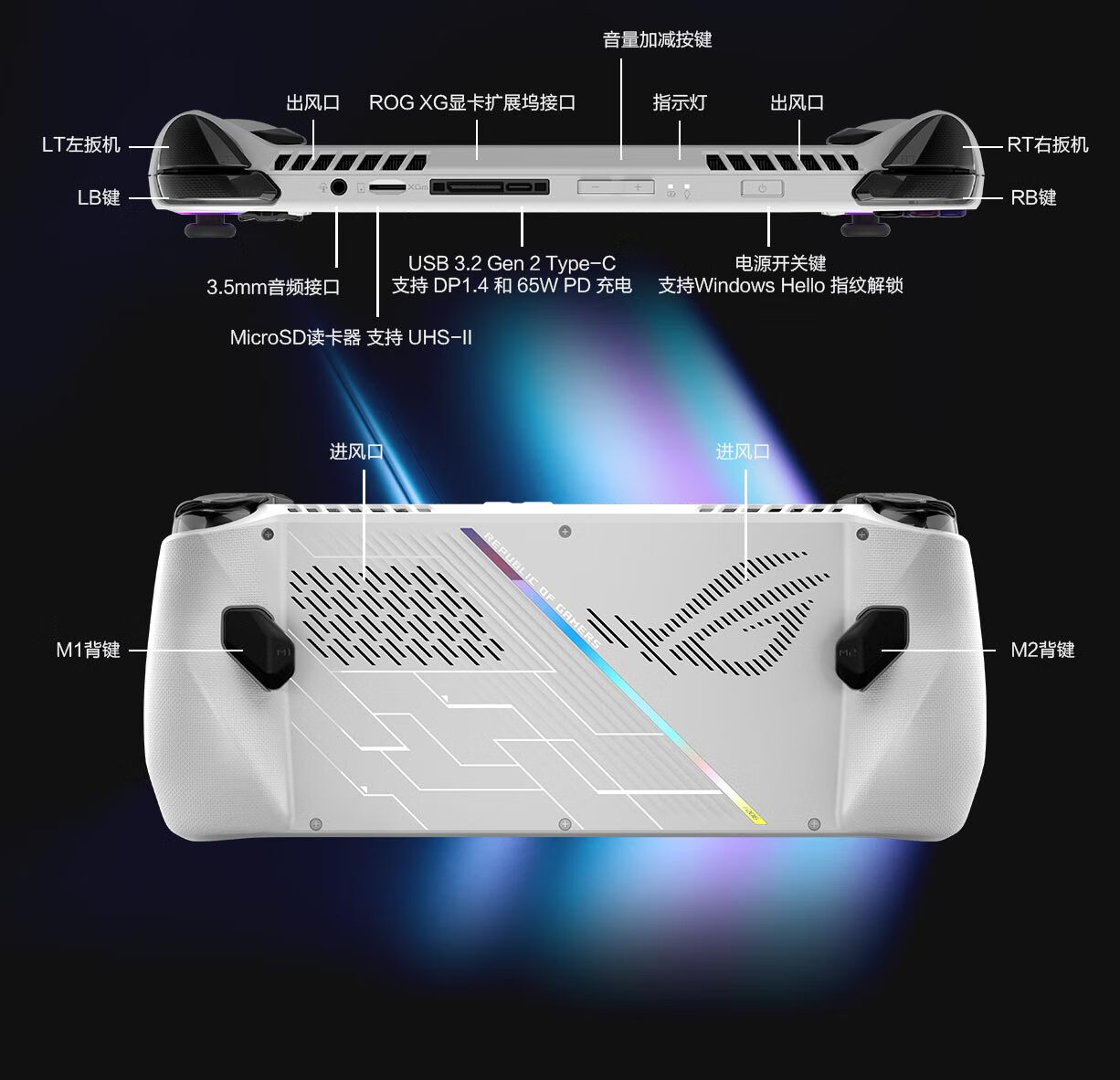 标配 7 英寸 1920*1080 分辨率的 120Hz 屏幕,500 尼特亮度和 7ms 延迟;重量 608g,配有双风扇散热,以及 16 GB LPDDR5 内存 + 512 GB PCIe 4.0 SSD,可通过 MicroSD 卡扩展存储,支持杜比全景声。