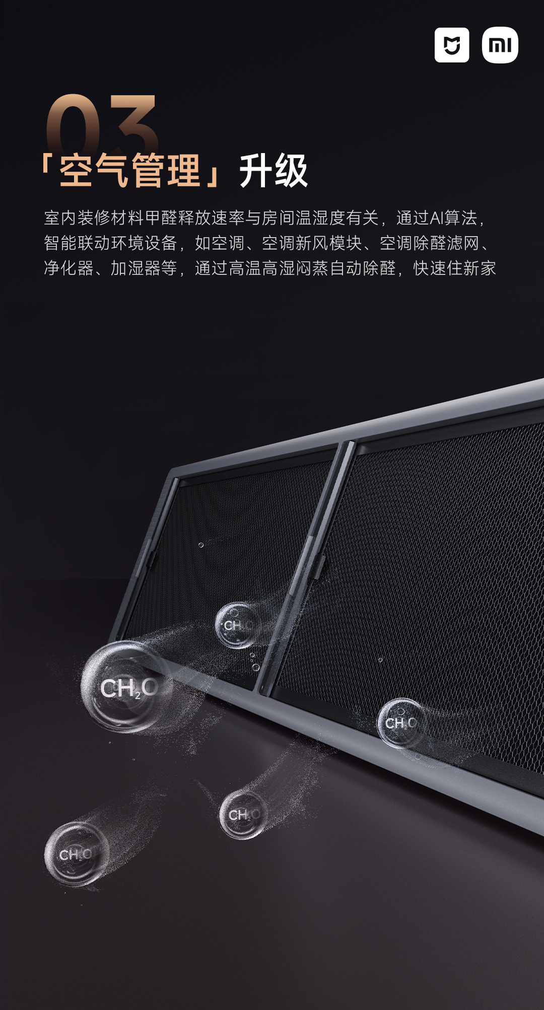 空气管理升级:室内装修材料甲醛释放速率与房间温湿度有关,通过 AI 算法,智能联动环境设备,如空调、空调新风模块、空调除醛滤网、净化器、加湿器等,通过高温高湿闷蒸自动除醛。