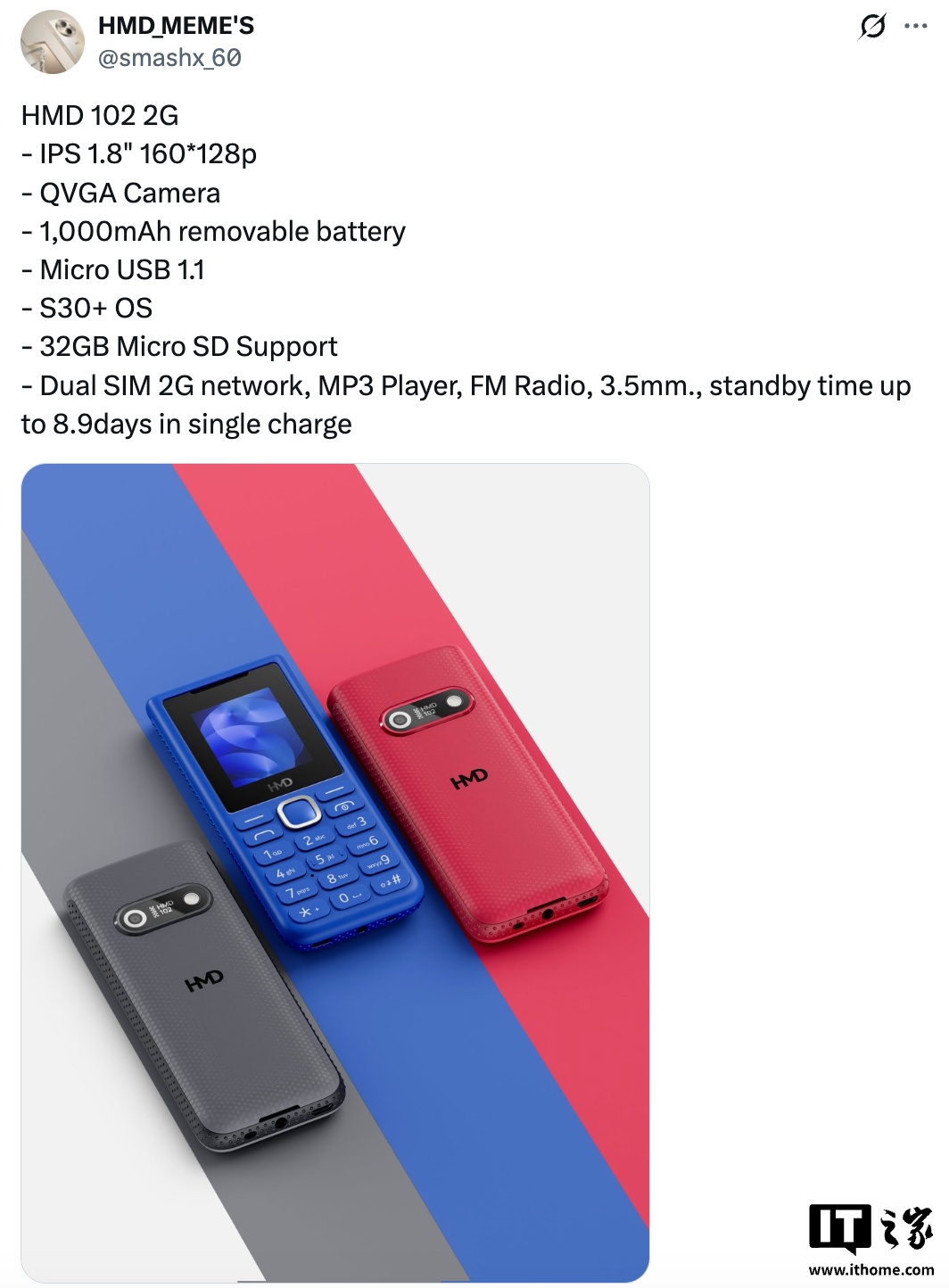 IT之家 4 月 27 日消息,消息源 smashx_60 现已曝光了 2026 款 HMD 102 2G 功能机,该机在 2026 年的今天仍配备了 Micro USB 接口,主要升级为 2G 双卡双待,作为比较,现款 HMD 102 功能机国行定价 169 元。