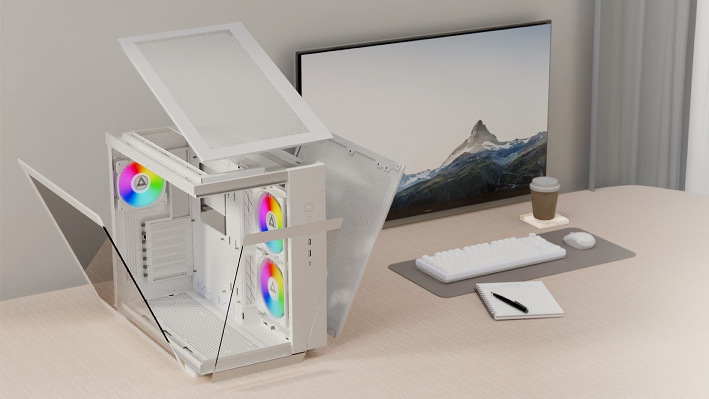 该机箱正面、左侧、顶部、右侧四个方面的面板均支持免工具拆装,可简化装机、日常清洁、配置调整流程;其中顶部和右侧面板分别有 60% 和 75% 区域覆盖以网孔,实现高效进出风。