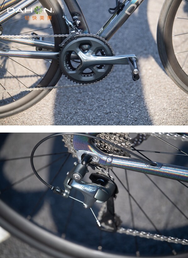 整车配置了Shimano Tiagra 20速变速系统,变速精准、换档自如。搭配52-36T牙盘与11-32T飞轮,该齿比搭配能够轻松应对95%以上的骑行路线,自信前行游刃有余。选对合适的档位便可轻松起步、高效踩踏与加速。
