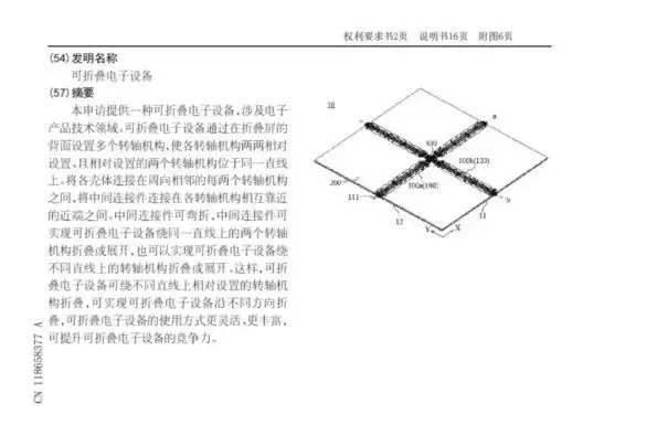 专利摘要显示,可折叠电子设备通过在折叠屏的背面设置多个转轴机构,使各转轴机构两两相对设置、且相对设置的两个转轴机构位于同一直线上。将各壳体连接在周向相邻的每两个转轴机构之间,将中间连接件连接在各转轴机构相互靠近的近端之间。中间连接件可弯折,中间连接件可实现可折叠电子设备绕同一直线上的两个转轴机构折叠或展开,也可以实现可折叠电子设备绕不同直线上的转轴机构折叠或展开。
