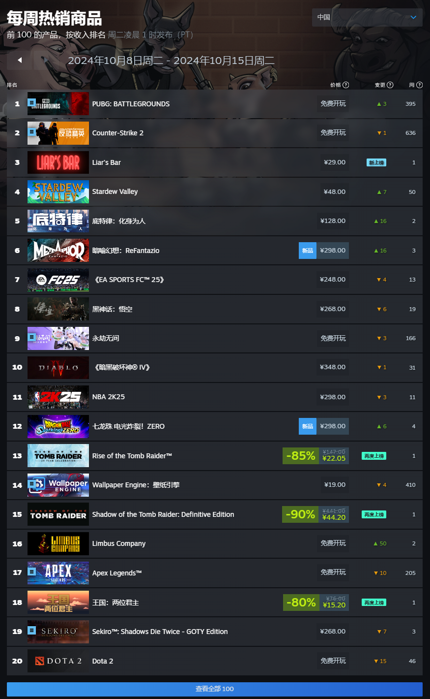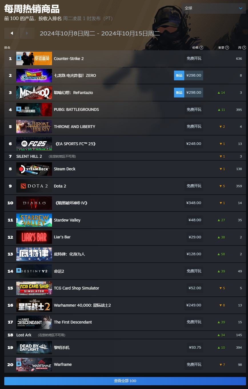 IT之家 10 月 15 日消息,Valve 今天公布了 Steam 平台最新一周销量榜(2024 年 10 月 8 日至 15 日)刚刚发生的《七龙珠电光炸裂!ZERO》以及《暗喻幻想:ReFantazio》顺势登顶。