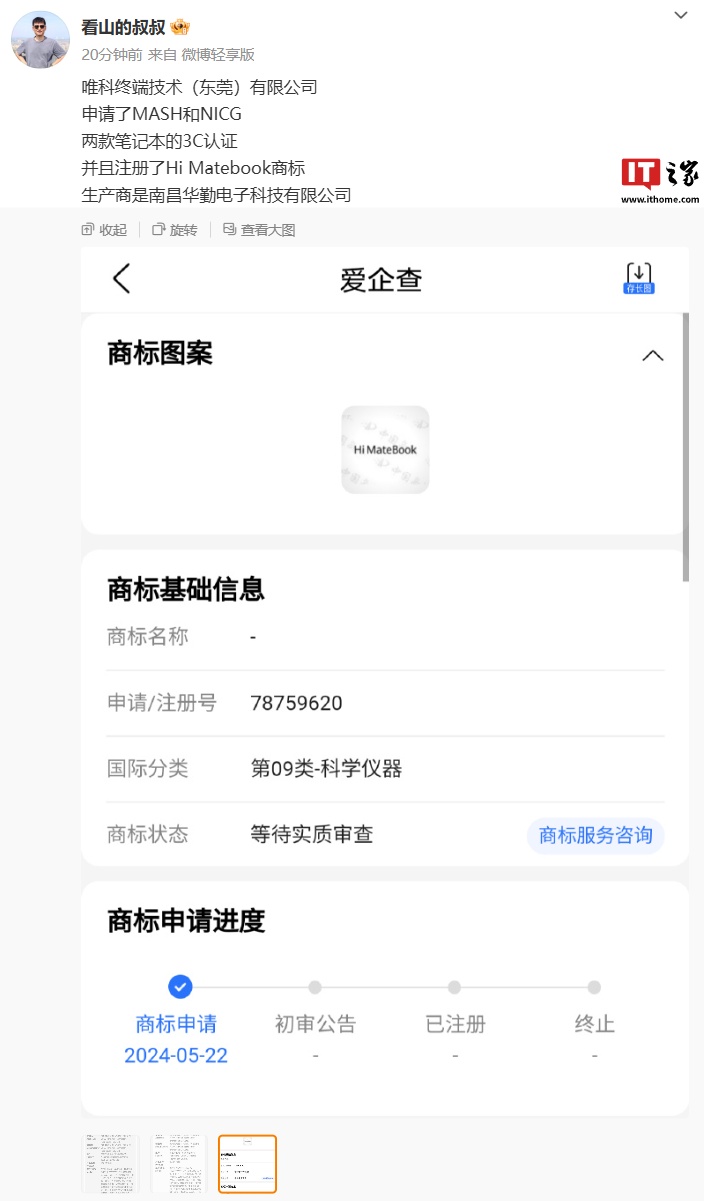 评论区中有网友询问“智选笔记本是英特尔加 Windows 吗?”,该问题得到博主的肯定。博主今日还放出了 Hi Matebook 商标注册情况:由唯科终端技术(东莞)有限公司于今年 5 月发起申请。