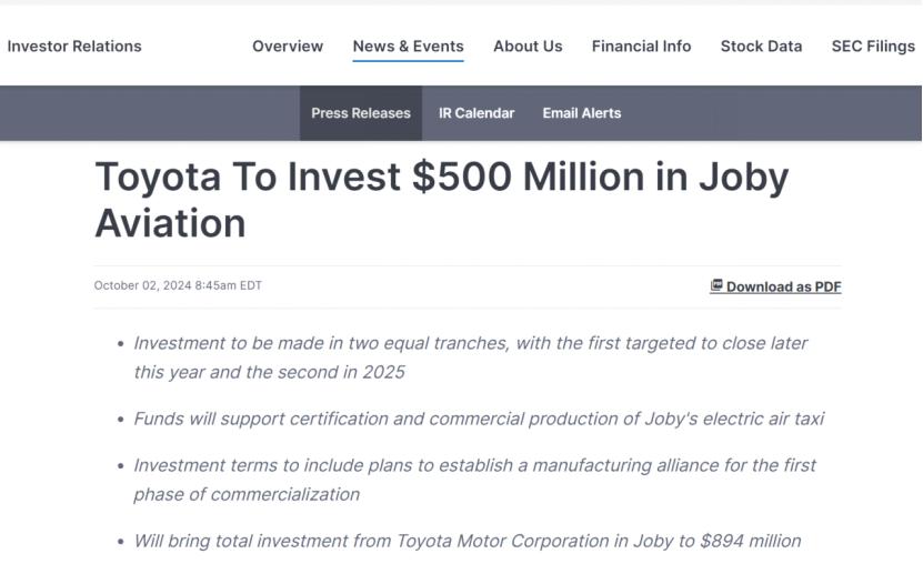 10月初,丰田汽车宣布,将对Joby额外投资5亿美元,约人民币35亿元。