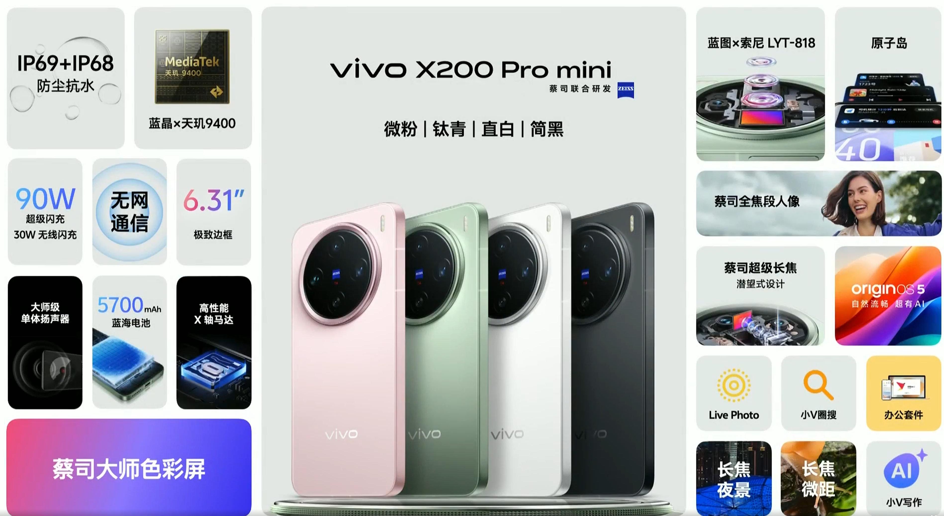另一款机型则是10月14日发布的vivo X200 Pro mini,搭载天玑9400、6.31英寸屏幕、5700mAh电池、90W有线/30W无线快充,摄像模组为LTY-818主摄+潜望式长焦,支持蔡司全焦段人像。