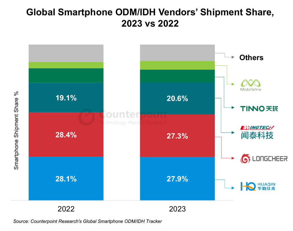 此外,据Counterpoint数据显示,2023年,独立设计公司/原始设计制造商(IDH/ODM)智能手机出货量同比持平,尽管整体智能手机出货量下降了4%。但它们对整体出货量的贡献达到了创纪录的水平。其中,华勤技术、龙旗空间和闻泰科技三家企业占2023年IDH/ODM总出货量的四分之三以上。