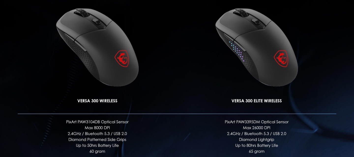 VERSA 300 WIRELESS 鼠标均支持微星 SWIFTSPEED 2.4GHz 无线、蓝牙 5.3 和 USB 2.0 有线三种连接方式,轮询率为 1000Hz。该系列鼠标左侧配有 2 颗侧键。侧裙为菱形图案设计,脚垫为纯 PTFE(IT之家注:即聚四氟乙烯)材质。