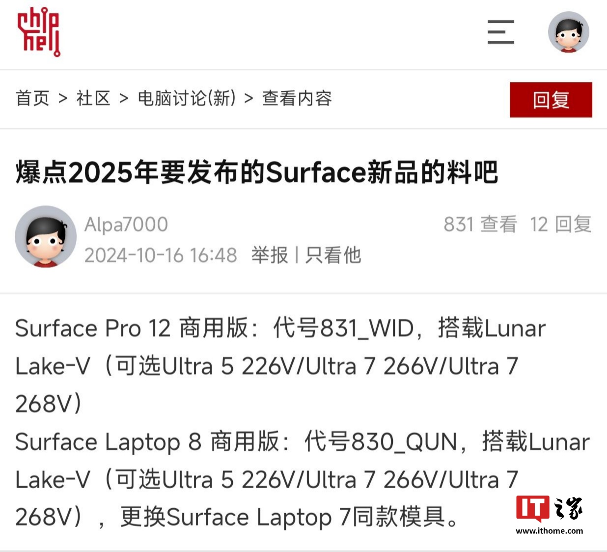 IT之家 10 月 18 日消息,网友 Alpa7000 于 10 月 16 日在 Chiphell 论坛发帖,分享了微软 2025 年 Surface 新品的相关信息。