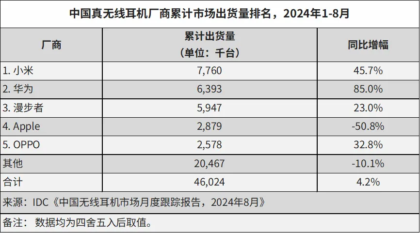 受到真无线整体市场增长乏力及价格不断下探所带来的激烈竞争影响,苹果出货量同比大幅下滑,但其出货额依旧在 2024 年 1~8 月真无线市场中累计排名第一。