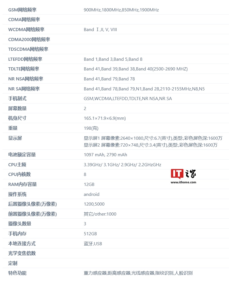 该机配备 8 核处理器,主频为 3.39GHz,此外配备 12GB 内存和 512GB 存储,电池方面为 1097 mAh+2790 mAh 双电池。