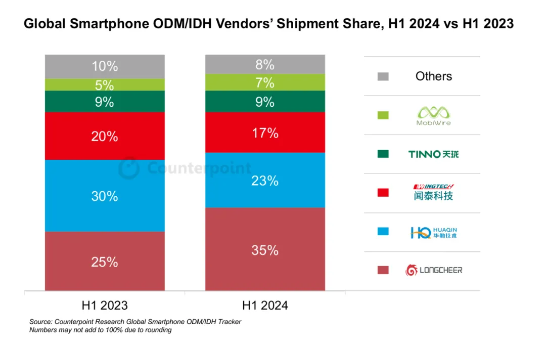 Counterpoint:龙旗领跑,2024上半年外包设计(ODM/IDH)智能手机出货量同比增长6%