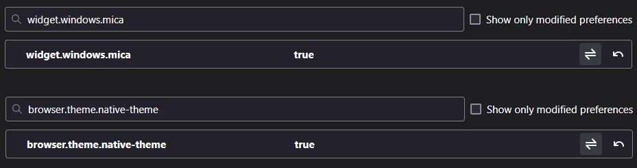 输入 browser.theme.native-theme 并点击带箭头的相同按钮。