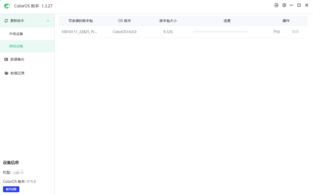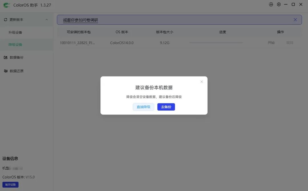 如有对应降级包,点击“开始”(下载-推送),将降级包推送至手机(弹出弹框提示“建议备份本机数据”后,若已备份可点击“直接降级”,若未备份可点击去备份)
