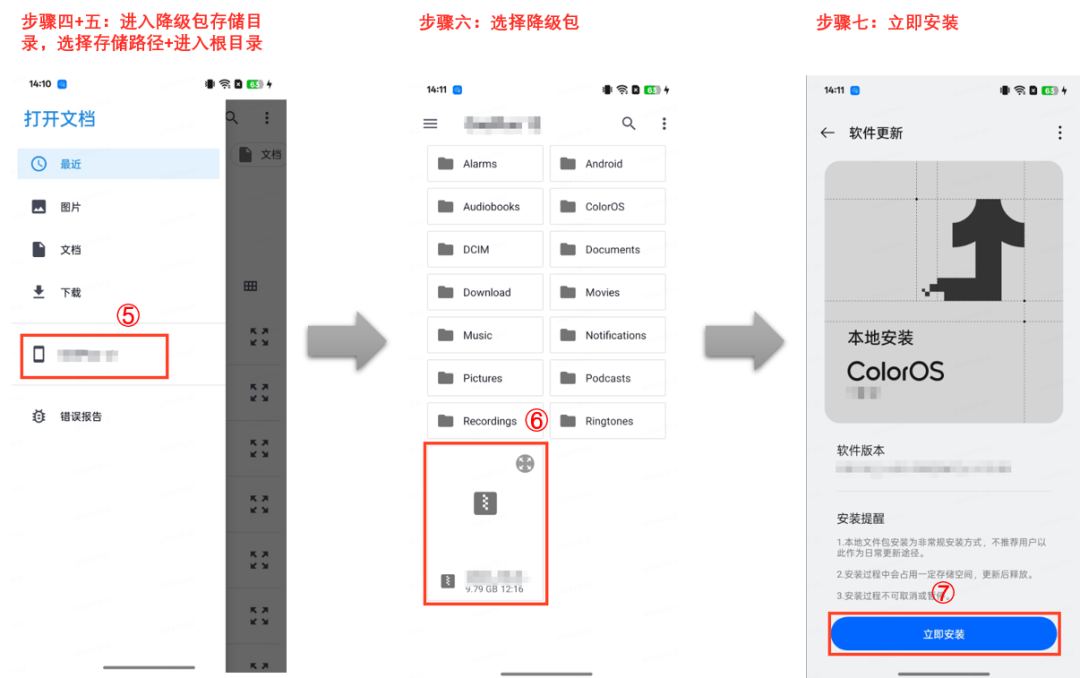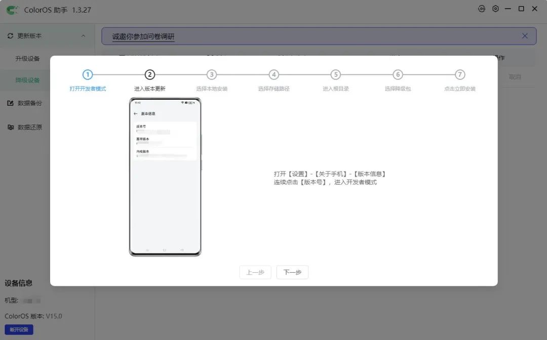 推送完成后,按照弹出的安装步骤提示,在手机上进行降级操作。