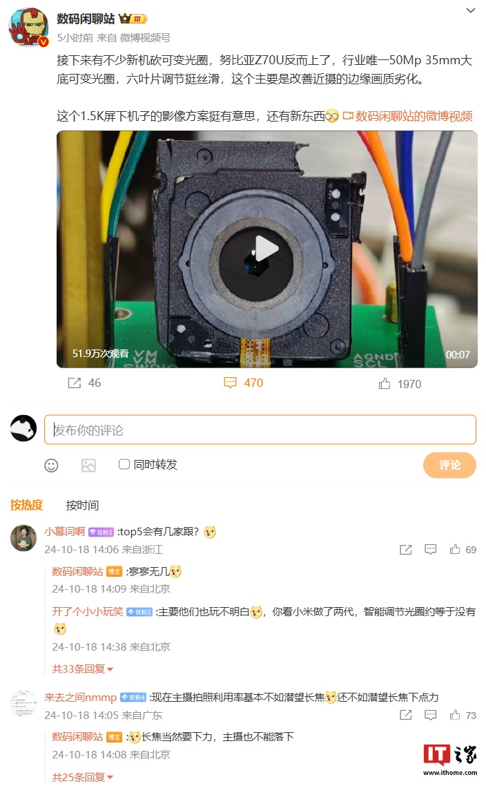 IT之家 10 月 18 日消息,博主 @数码闲聊站 今日发文透露,后续部分新机将取消可变光圈设计,努比亚 Z70 UItra 手机将搭载行业唯一 50Mp 35mm 大底可变光圈、支持六叶片调节,可改善近摄的边缘画质劣化。