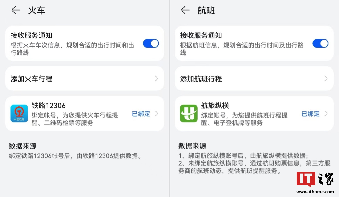 据此前报道,华为智慧助手分别于今年 2 月和 8 月获推众测更新,支持用户绑定 12306 和航旅纵横账号,并在负一屏显示火车、航班行程信息。