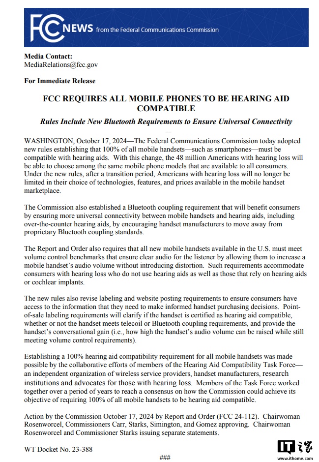 当地时间 10 月 17 日,美国联邦通信委员会(FCC)发布公告,要求今后所有在美国销售的移动电话都必须兼容助听器。此外,FCC 还制定了有关音量控制和改进产品标签的新规,以便帮助用户做出更明智的购买决策。