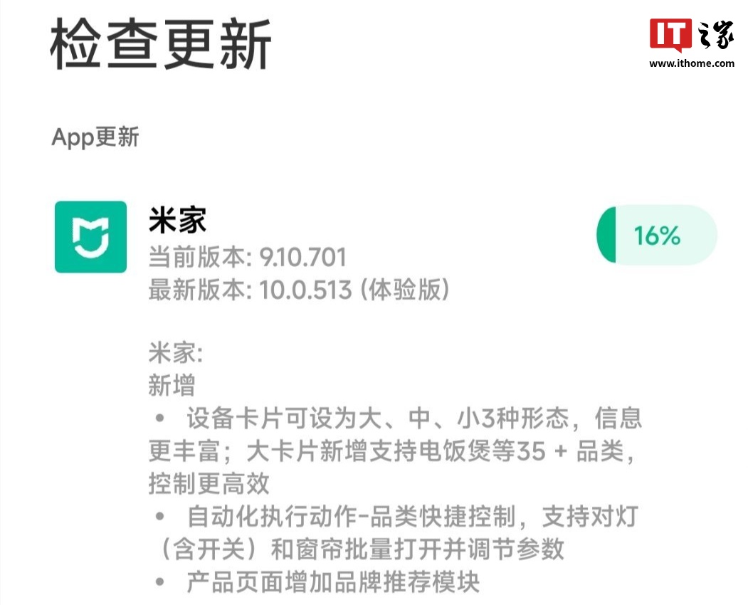 米家 App 10.0.513 体验版更新日志仅显示 3 项升级内容,IT之家整理米家新版本已知升级内容如下: