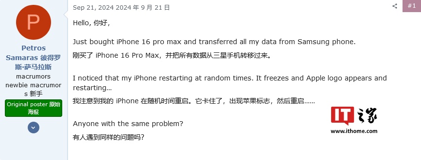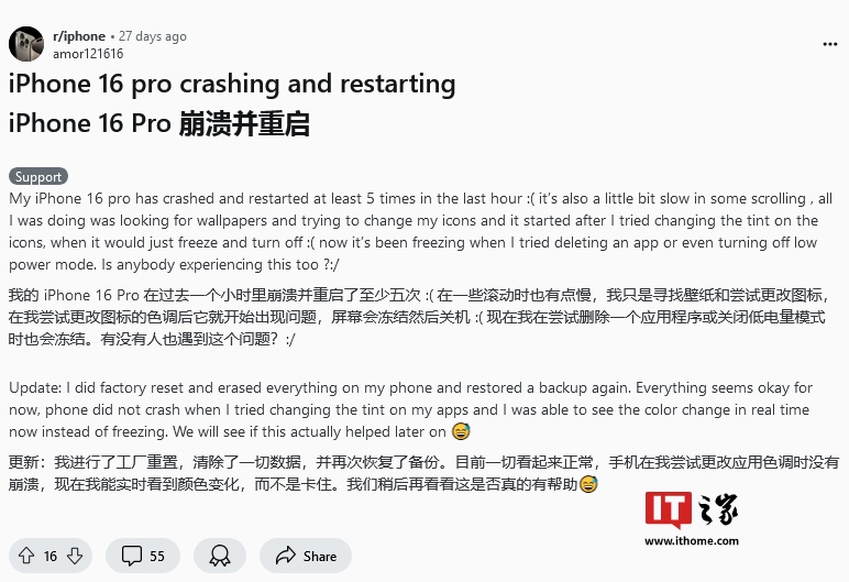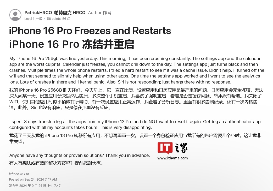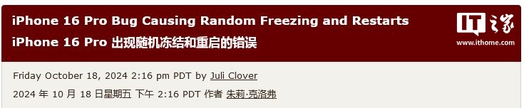 IT之家 10 月 19 日消息,科技媒体 MacRumors 昨日(10 月 18 日)发布博文,报道查询 Reddit 社区、该媒体论坛、苹果支持论坛等,发现部分 iPhone 16 Pro 用户反馈存在随机卡死、重启的问题。