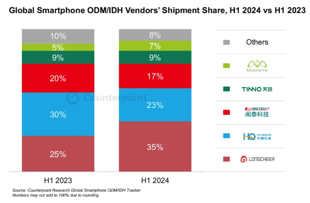 此外,据Counterpoint数据显示,2023年,独立设计公司/原始设计制造商(IDH/ODM)智能手机出货量同比持平,尽管整体智能手机出货量下降了4%。但它们对整体出货量的贡献达到了创纪录的水平。其中,华勤技术、龙旗空间和闻泰科技三家企业占2023年IDH/ODM总出货量的四分之三以上。