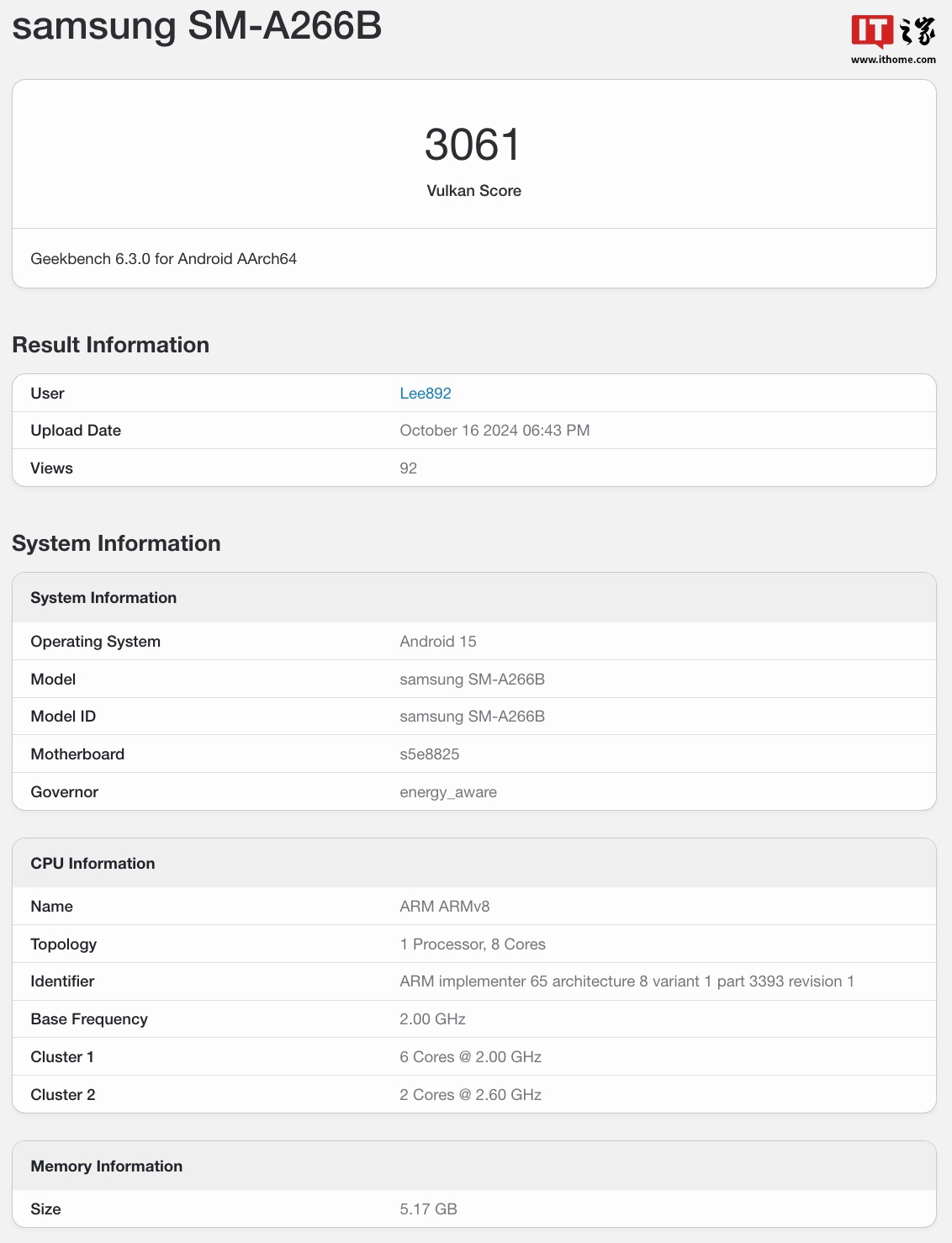 IT之家 10 月 19 日消息,三星旗下 Galaxy A26 手机现已现身 Geekbench 跑分库,IT之家注意到该机型号为 SM-A266B,依然搭载 Exynos 1280 处理器,内置 6GB RAM,Vulkan 跑分为 3061 分。