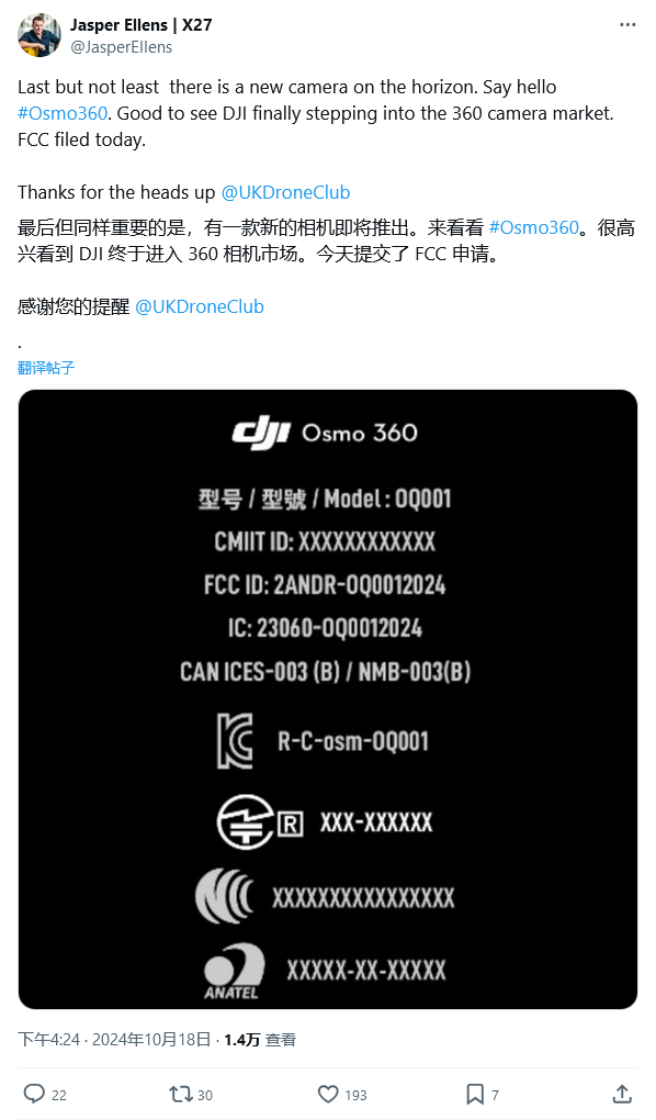 IT之家 10 月 19 日消息,消息源 @JasperEllens 昨日(10 月 18 日)在 X 平台发布推文,曝料称根据最新披露的 FCC 文件,大疆(DJI)正在准备推出其首款 360 度运动相机 Osmo 360。