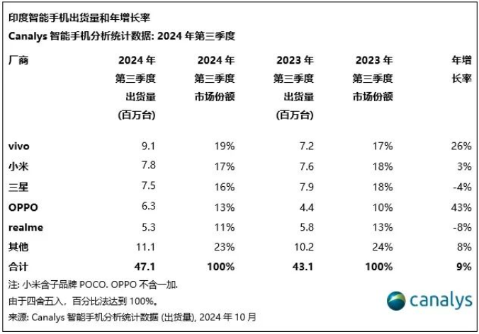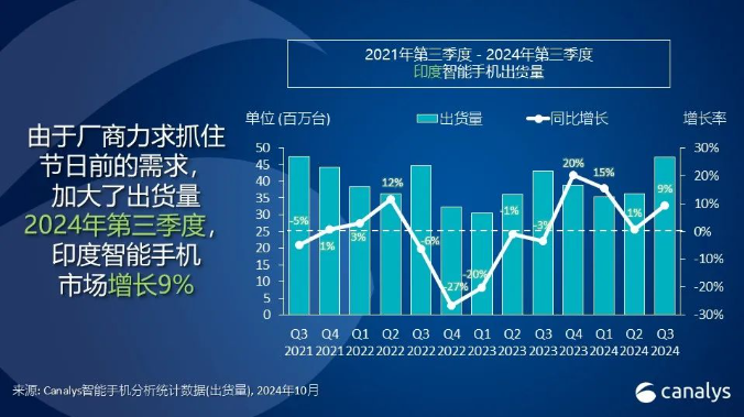 近日,据Canalys数据显示,2024年第三季度,印度智能手机市场增长9%,出货量达4710万台。