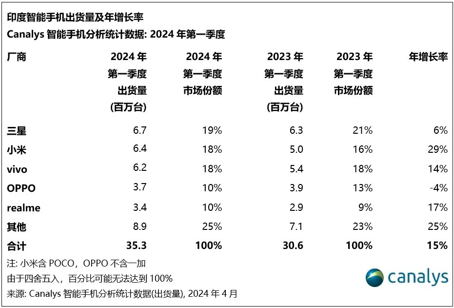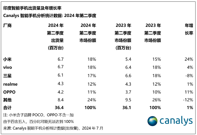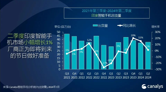 2024年第二季度,在印度大选、季节性需求低迷以及部分地区极端天气等各种因素的影响下,印度智能手机市场微增1%,总出货量达3640万台。