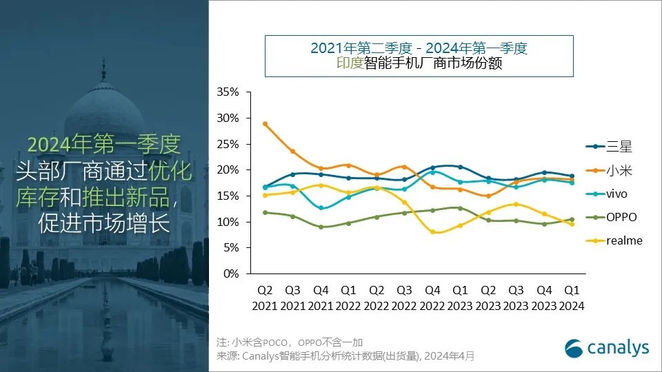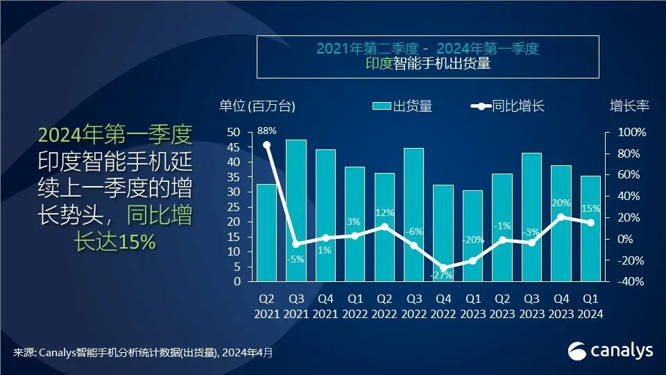 2024年第一季度,印度智能手机市场表现强劲,出货量达3530万部,同比增长15%。进入2024年后,厂商的库存情况有所改善,这使得渠道能够承接本季度推出的多款新品。由于2023年第一季度出货量较低,市场面临通胀压力、需求疲软、库存等问题,因此第一季度市场同比增长15%。