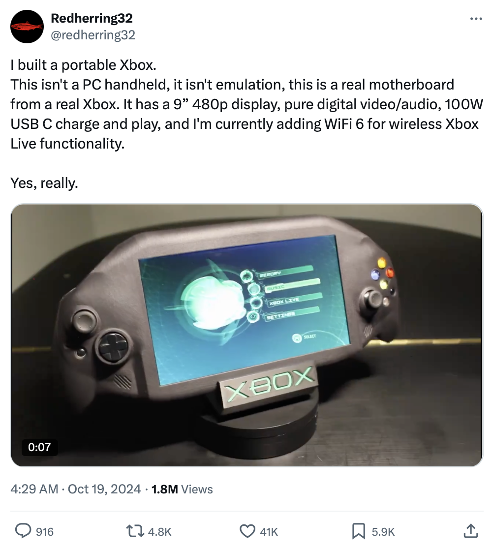 IT之家 10 月 20 日消息,虽然微软官方的 Xbox 掌机还停留在“传说”阶段,不过目前有开发者 Redherring32 在 X 平台发帖,介绍了自己利用初代 Xbox 主板组装而成的爱好者版本 Xbox 掌机。