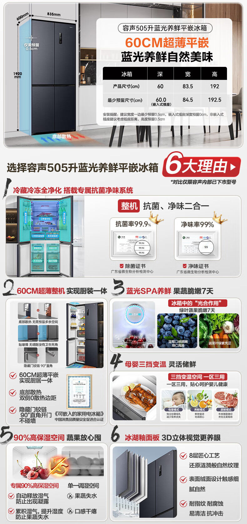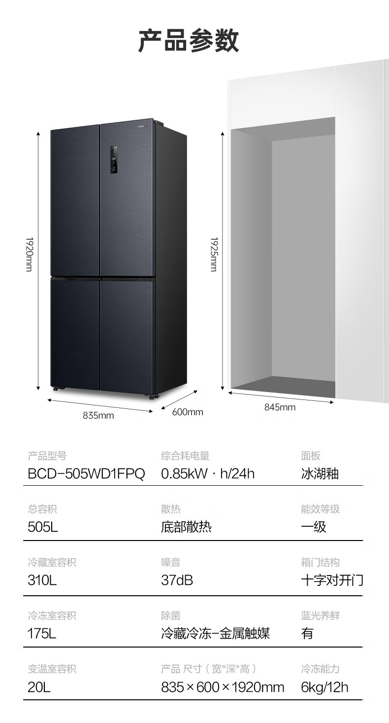 容声 BCD-505WD1FPQ 超薄平嵌十字门冰箱总容积 505 升,冷藏室容积 310 升,冷冻室容积 175 升,变温室容积 20L。
