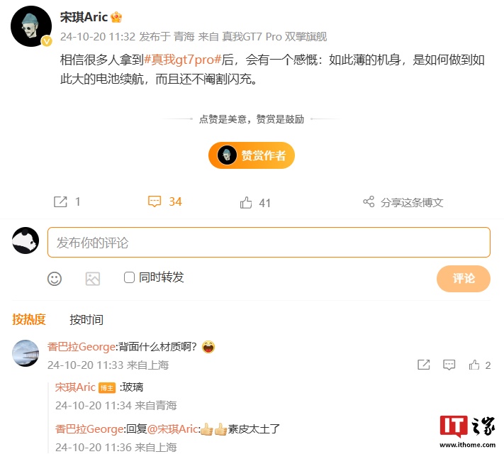 有网友在该微博下留言询问新机的后盖材质,@宋琪Aric 回复称“玻璃”。