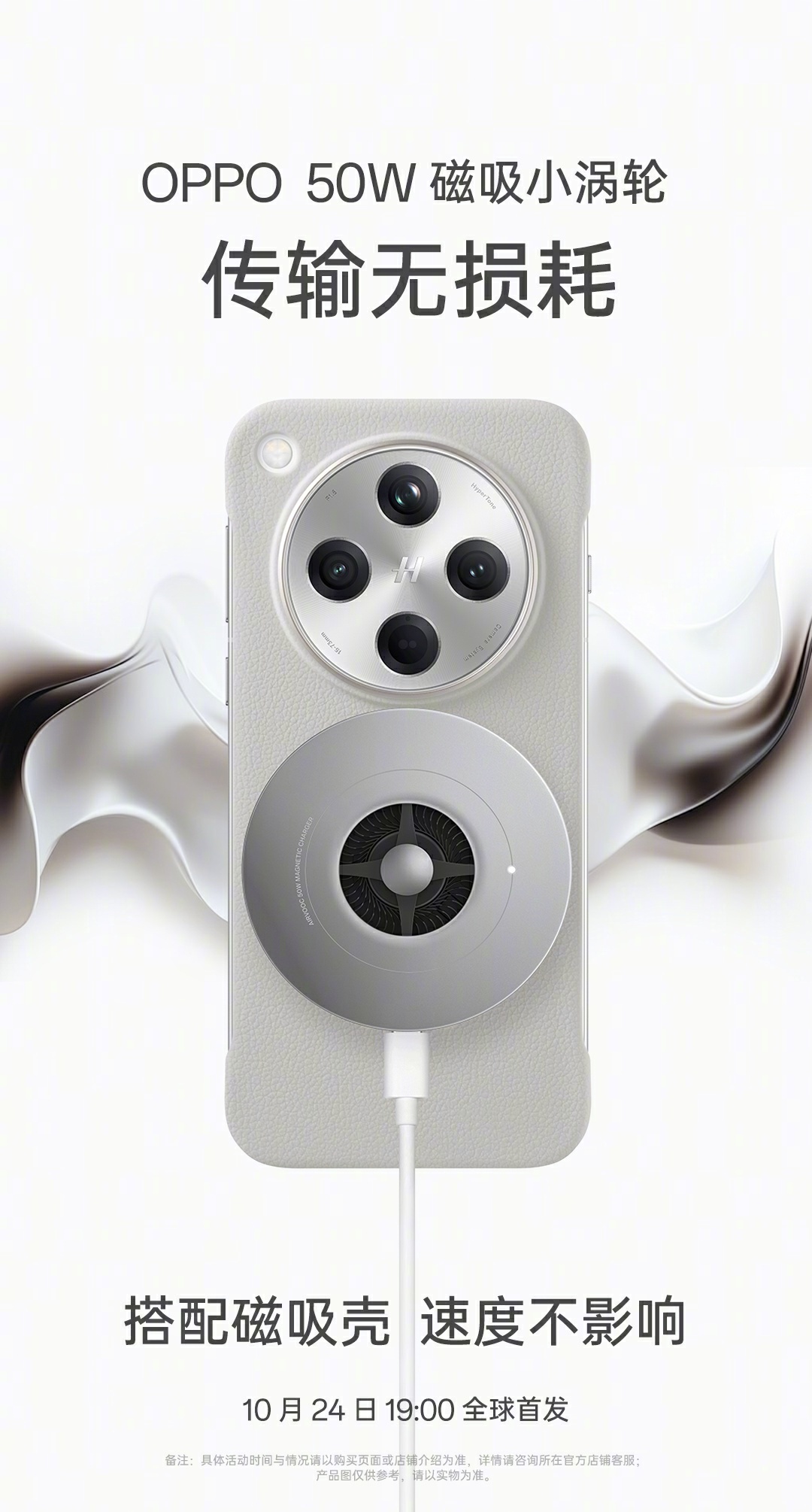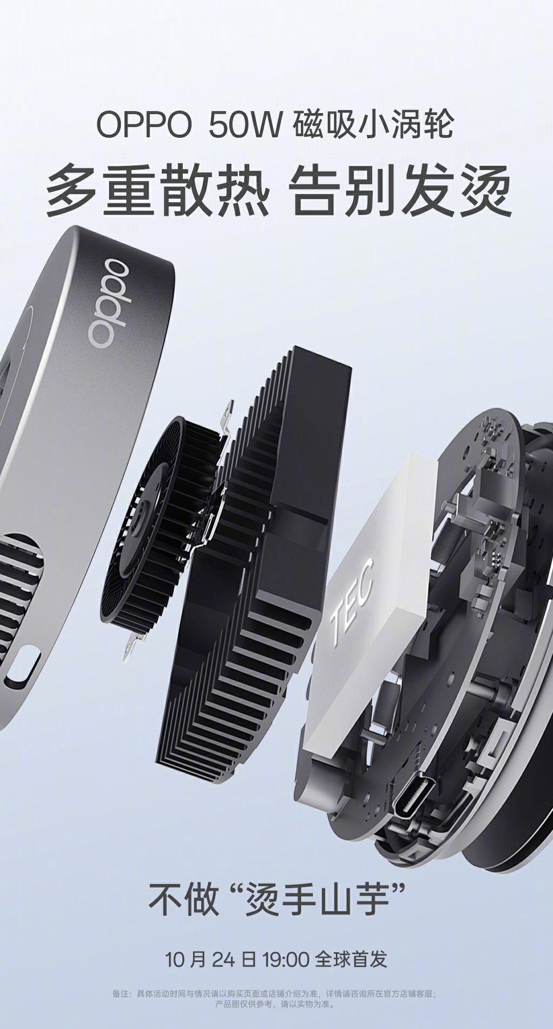IT之家注意到,OPPO 还预热了无线充电器“磁吸小涡轮”,支持 50W 功率无线充,同样支持苹果与安卓,号称“不做烫手山芋”。