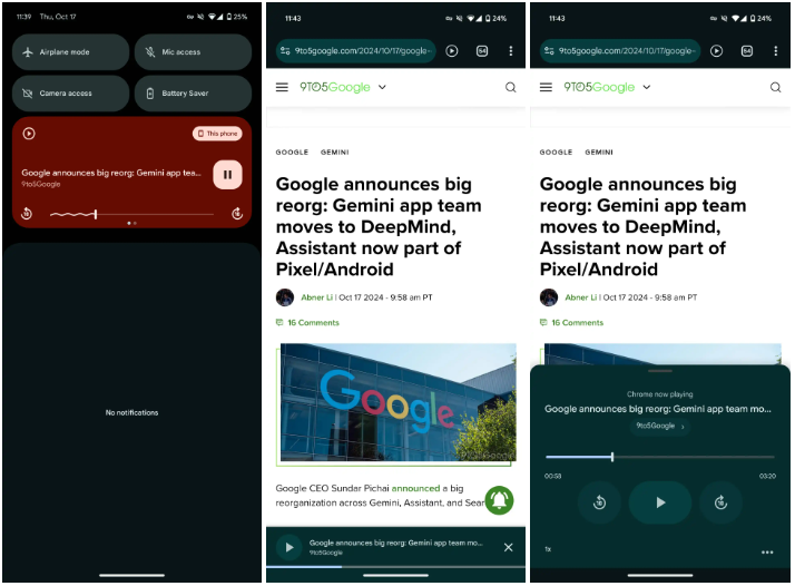 使用此功能时,用户只需启动“收听此页面”功能,然后切换到其他应用或关闭手机屏幕,音频将继续在后台播放。用户可以通过通知栏中的媒体播放器来控制播放进度。