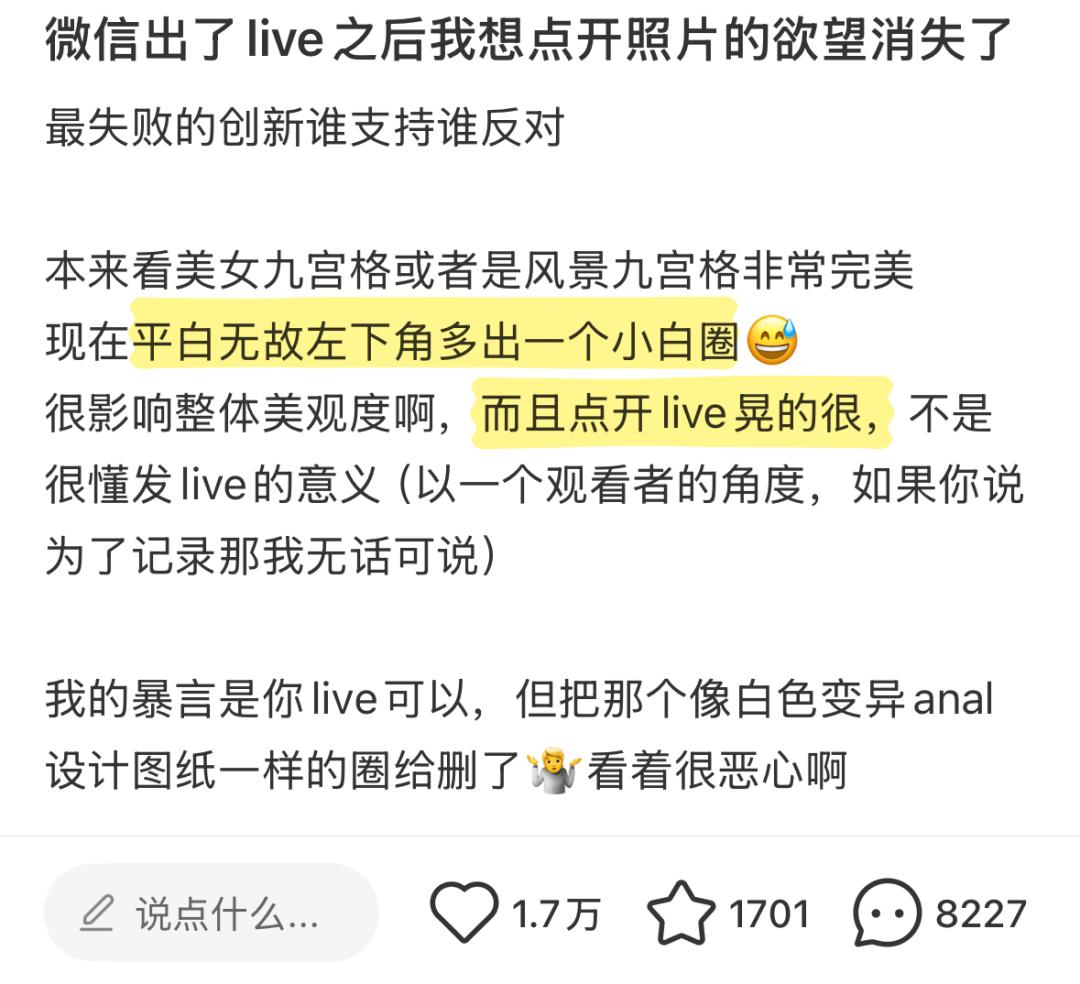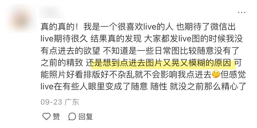 有位网友原本期待 Live 图很久,结果现在大家都发 Live 图之后,她反而因为图片不精致了,模糊了,失去了点开的欲望。