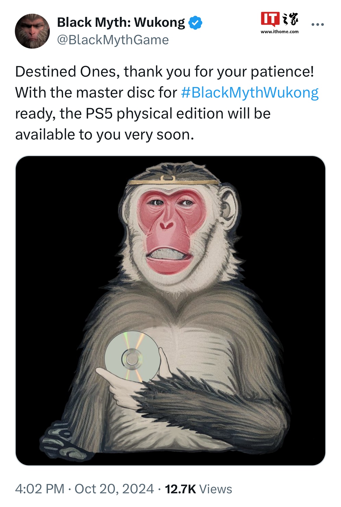 IT之家 10 月 21 日消息,游戏《黑神话:悟空》官方于昨日在 X 平台发文,称 PS5 实体光盘已经准备就绪,将很快与各位天命人见面。