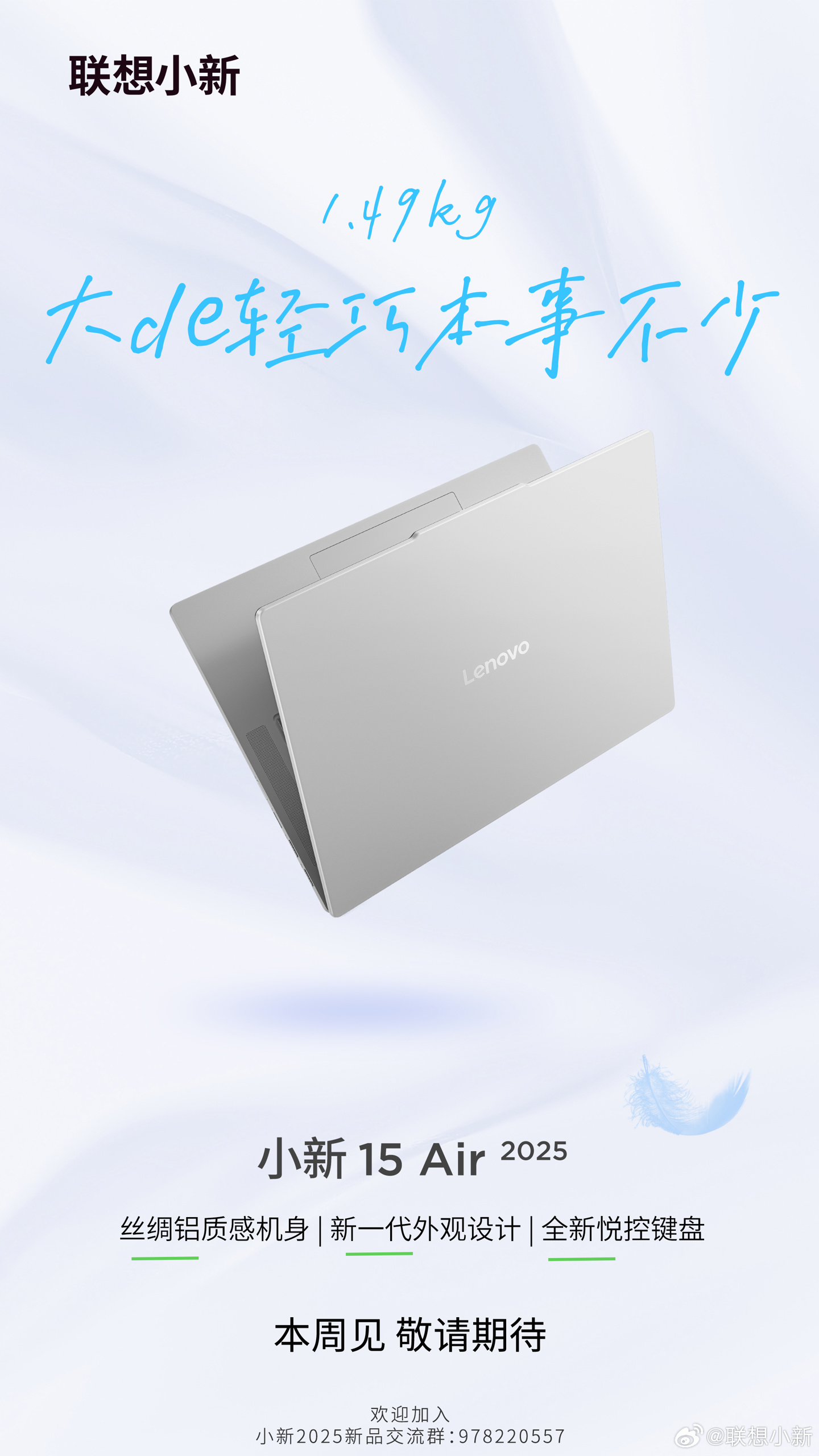 IT之家 10 月 21 日消息,联想官方今日发文宣布,联想小新 Air 2025 款笔记本“本周见”,包含 13 Air 和 15 Air 两款。